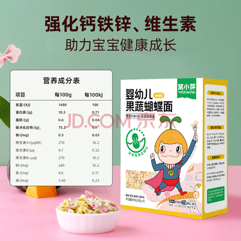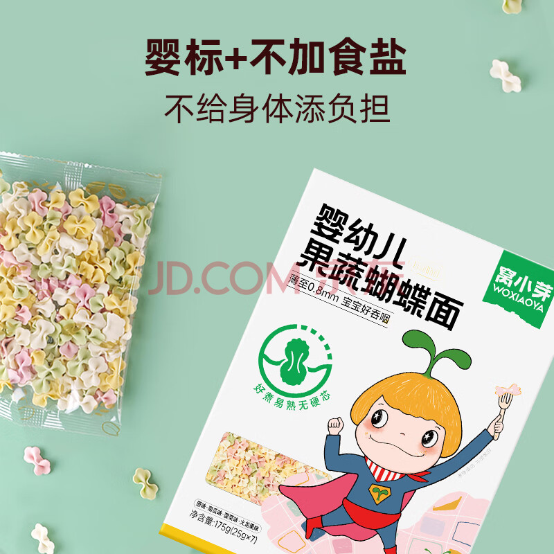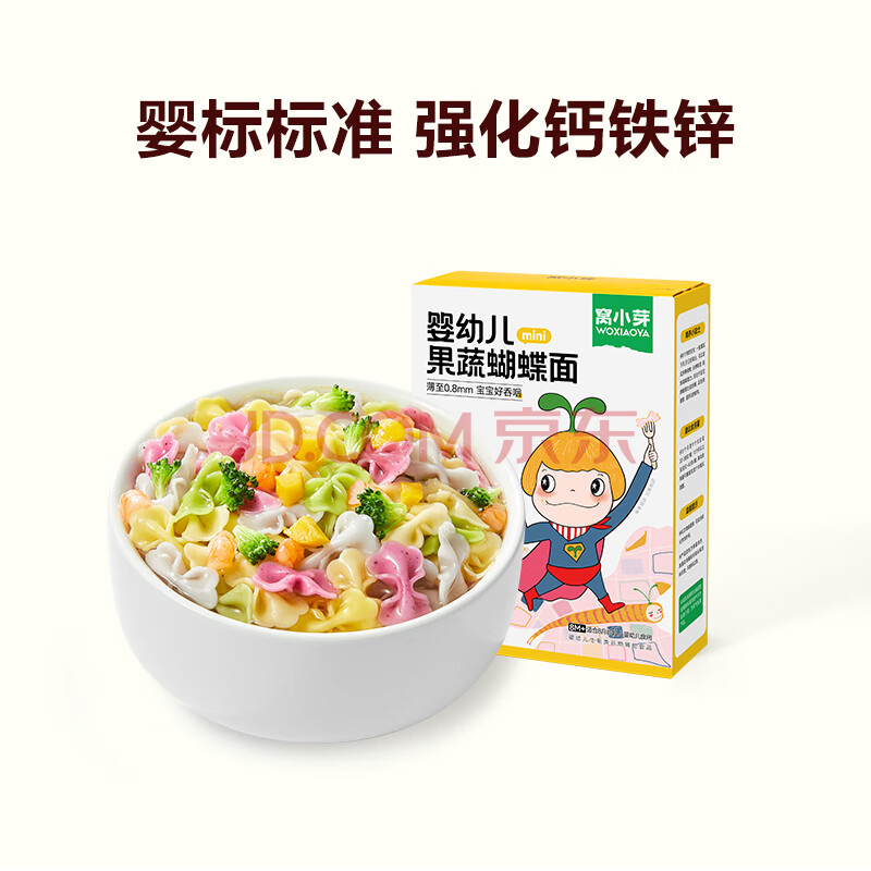 商品相册:窝小芽婴幼儿蝴蝶面175g/盒 宝宝面条辅食儿童早餐钙铁锌无添加盐白砂糖第