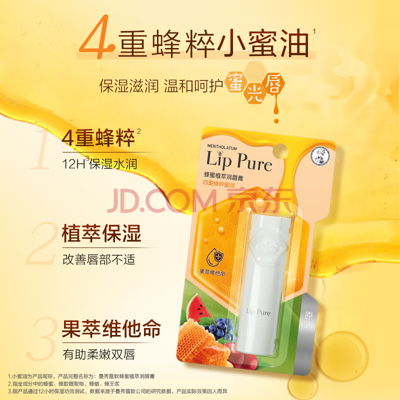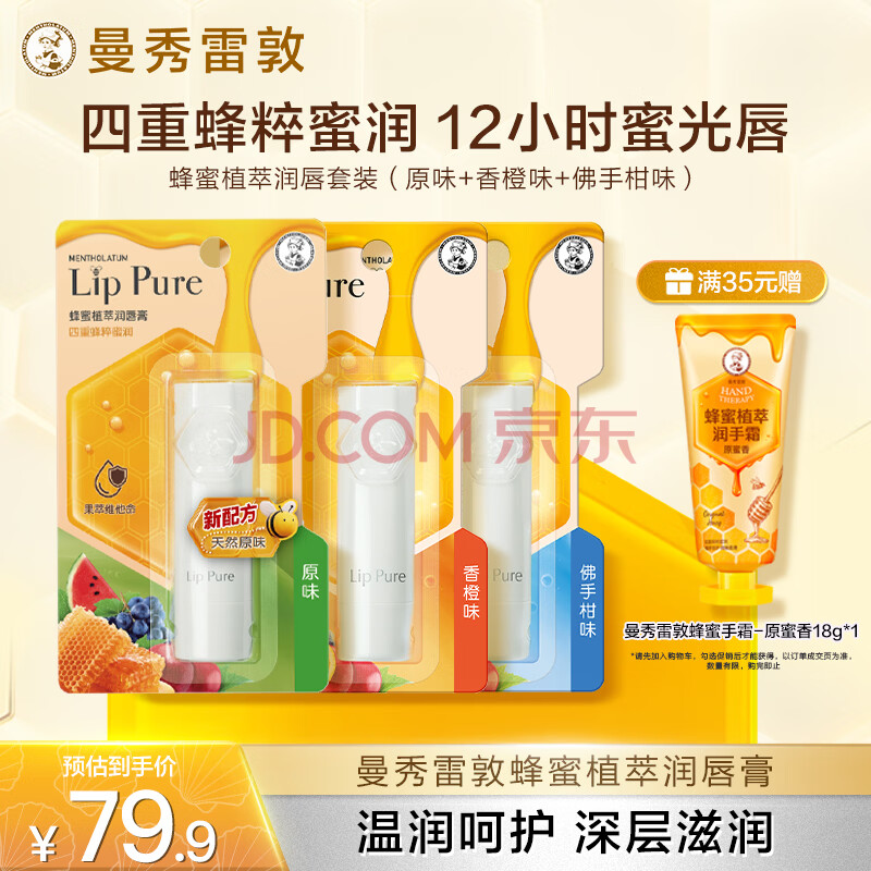 商品相册:曼秀雷敦蜂蜜润唇膏 男女生保湿滋润唇膜淡化唇纹 香橙味+原味+佛手柑味第