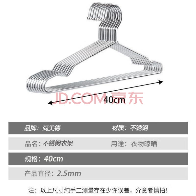 商品相册:尚美德 不锈钢衣架 加粗加大无痕防滑带凹槽 40cm成人通用款【20个装】第