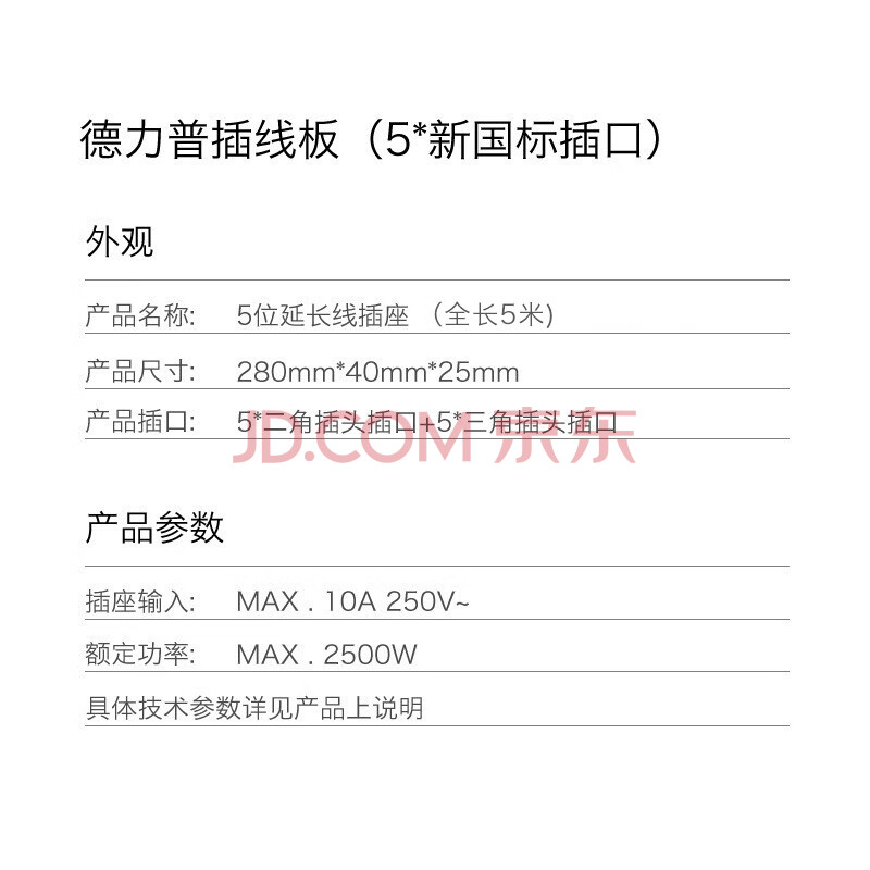 商品相册:德力普(Delipow) 插座 新国标排插 插线板/插排/接线板/拖线板 5孔位总控全长5米第