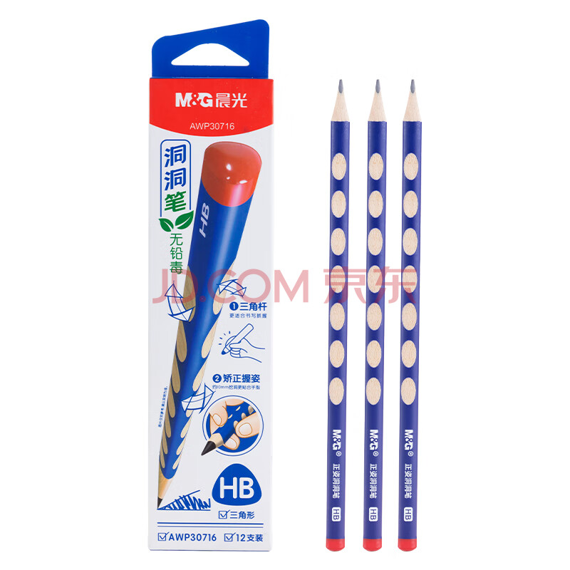 商品相册:晨光(M&G)文具 HB洞洞铅笔12支 小学生开学练字铅笔 儿童正姿矫姿 三角木杆铅笔 沾顶易抓握AWP30716第