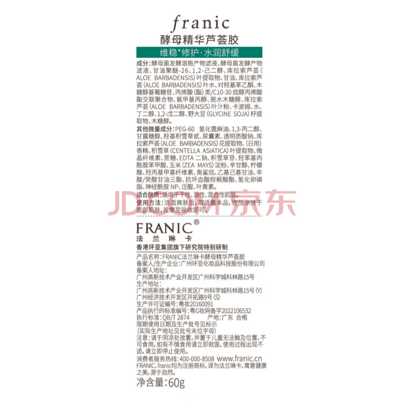 商品相册:法兰琳卡酵母精华芦荟胶修护皮肤晒后祛痘保湿补水舒缓控油60g第