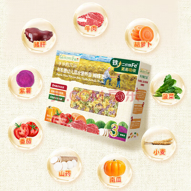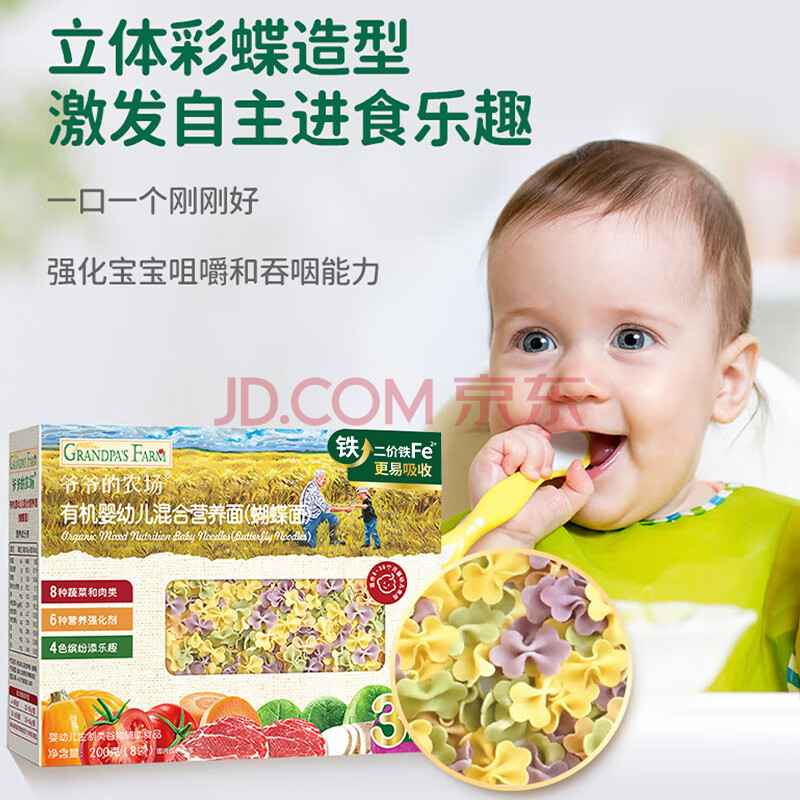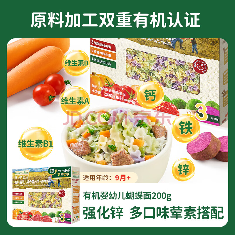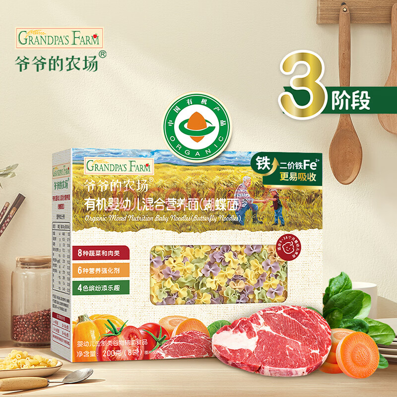 商品相册:爷爷的农场有机婴幼儿蝴蝶面200g 宝宝辅食婴儿面条儿童早餐钙铁锌6-12个月第1张/共6