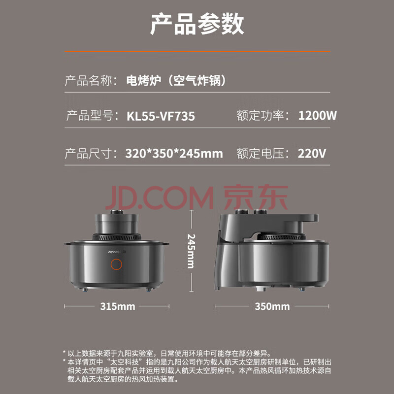 商品相册:九阳(Joyoung)【无百变量杯】太空系列不用翻面空气炸锅家用智能可视机身 5.5L大容量 蒸烤炸一体机 KL55-VF735第