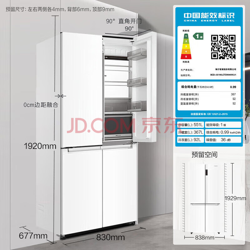 商品相册:卡萨帝(Casarte)551升纯白系列零距离自由嵌入式十字双开门四门超薄白色电冰箱一级能效家用BCD-551WLCTDM4WKU1第