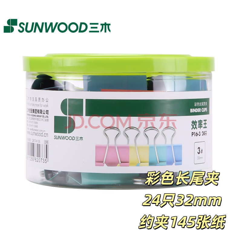 商品相册:三木(SUNWOOD)效率王系列 24只32mm 3#彩色长尾夹/金属票据夹/燕尾夹 P16-3第