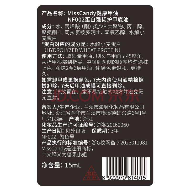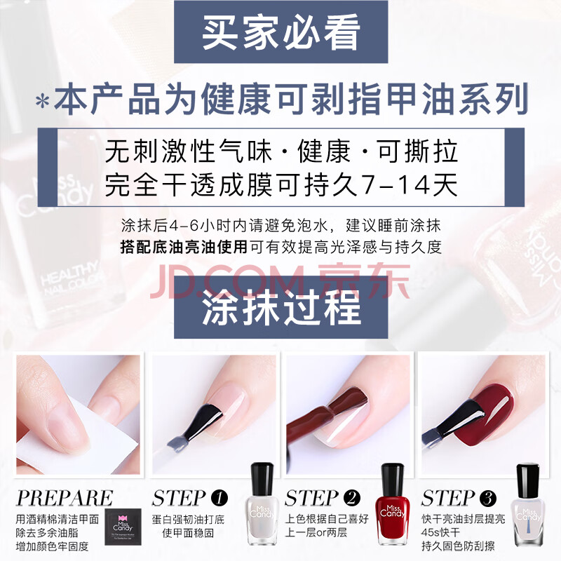 商品相册:Miss Candy健康透明指甲油15ml蛋白强韧底油免烤快干可撕拉护甲油持久NF002第