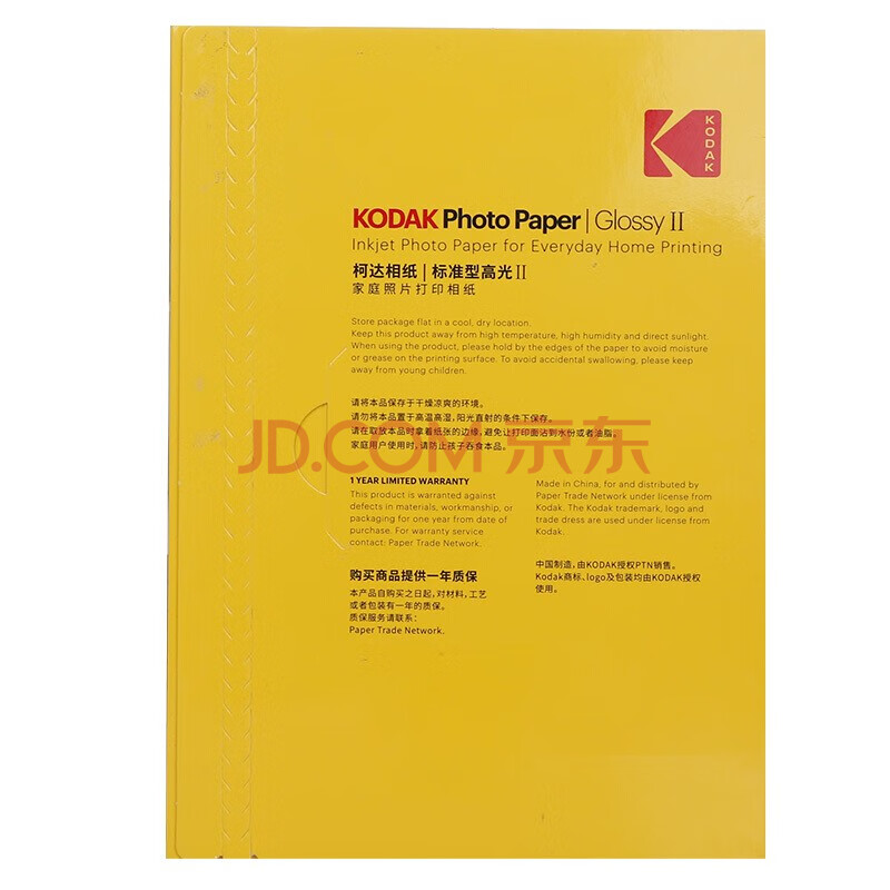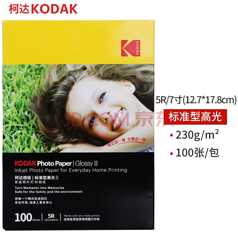 商品相册:KODAK柯达 5R/7英寸 230g 家用厚型高光面打印相片纸/喷墨打印照片纸/相纸 100张装9891-440第