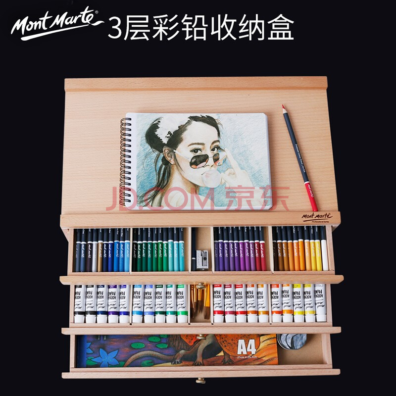 商品相册:蒙玛特(MontMarte)榆木画箱3层抽屉画盒颜料画笔铅笔套装收纳盒大容量桌面绘画工具储物箱美术收纳箱V第