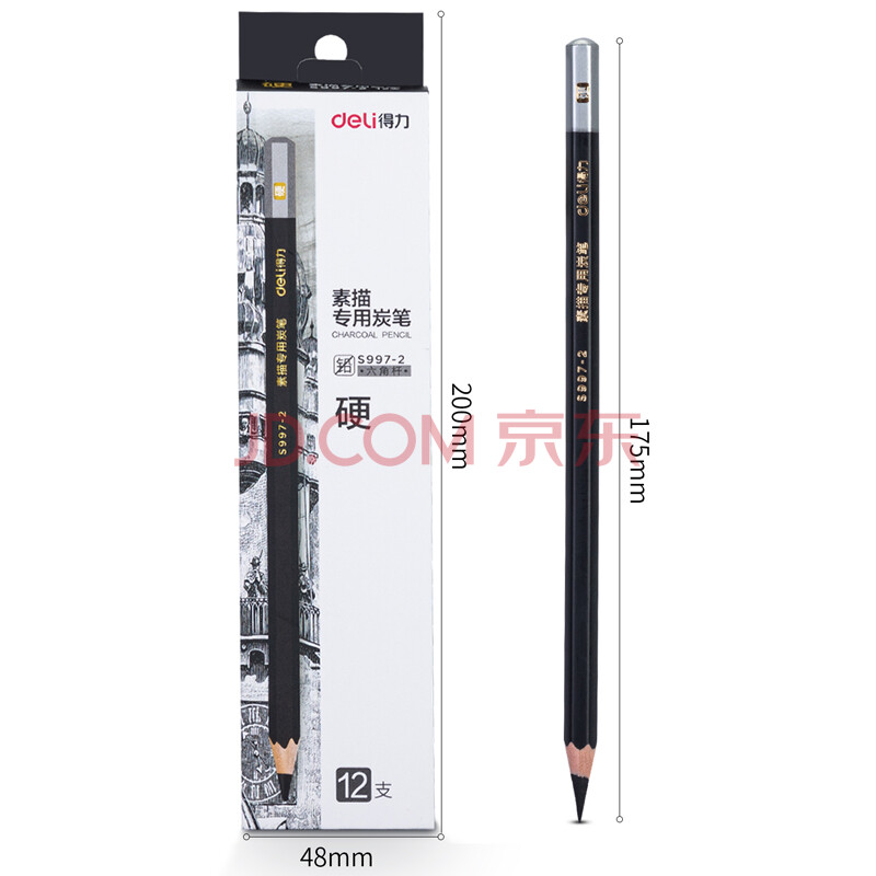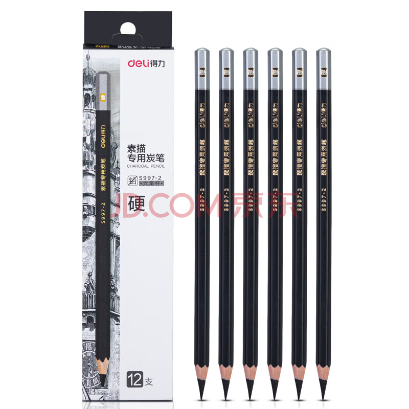 商品相册:得力(deli)12支/盒硬炭素描炭笔初学者碳笔软中硬绘画美术生专用S997-2绘画勾线第