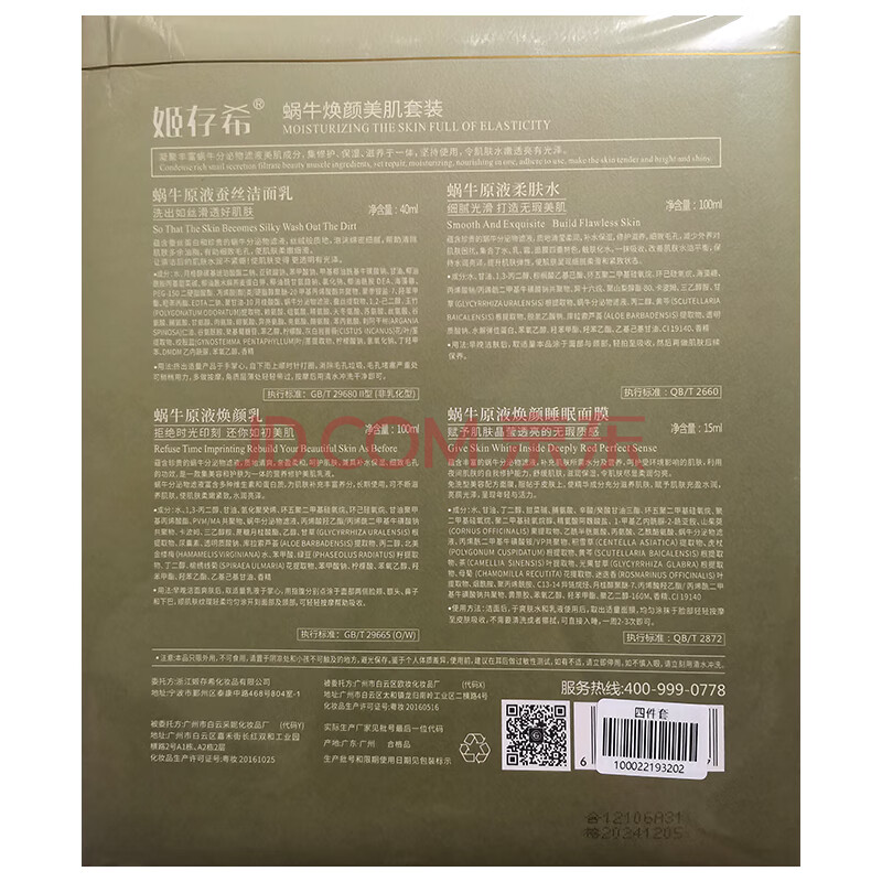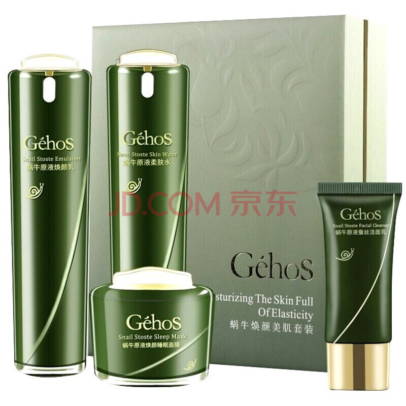 商品相册:姬存希护肤套装四件套礼盒蜗牛精华水乳液补水保湿礼物焕颜美肌套装(洁面乳+柔肤水+焕颜乳+睡眠面膜)第
