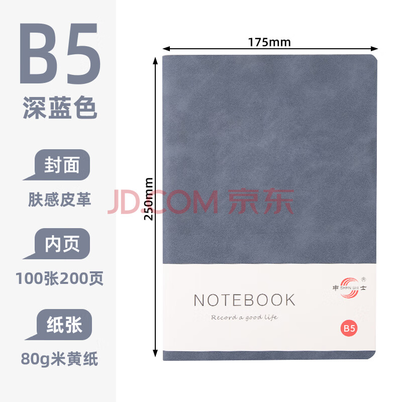 商品相册:申士(SHEN SHI)B5/18K商务笔记本子肤感皮面记事本软面笔记本日记本100张记事本可定制JD18-100深蓝色1本第
