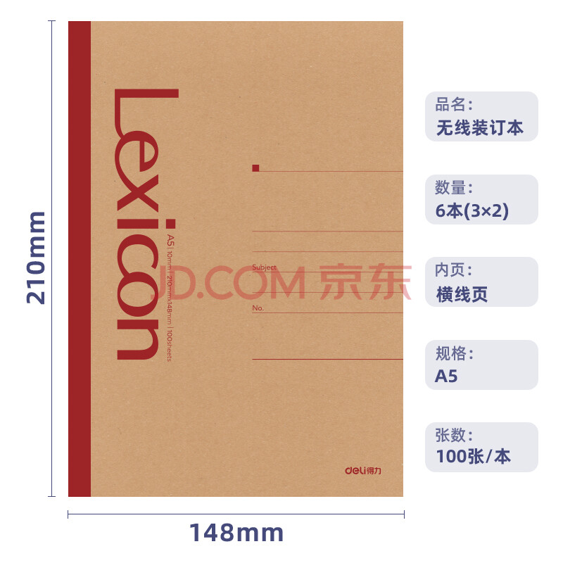 商品相册:得力(deli)6本A5/100张办公笔记本子 记事本草稿本无线装订本子学生用品 混色23212第