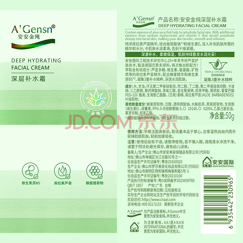 商品相册:安安金纯A'Gensn鲜芦荟深层补水霜锁水保湿温和滋润50g*2第