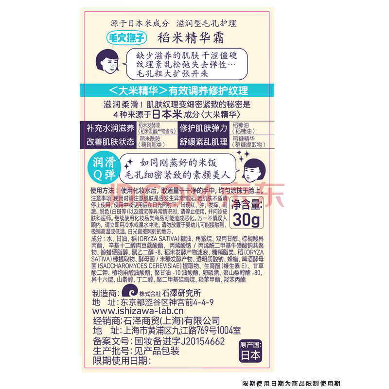 商品相册:石泽研究所 稻米精华霜30g日本米成分补水保湿滋润收紧毛孔第