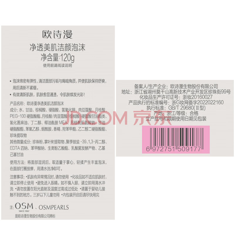 商品相册:欧诗漫(OSM)净透美肌洁颜泡沫洗面奶120g洁面乳清洁保湿生日礼物第