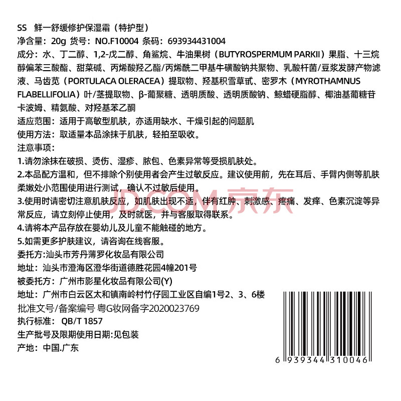 商品相册:鲜一特护霜舒缓保湿泛红修护皮肤屏障角鲨烷敏感肌肤护肤品20g第