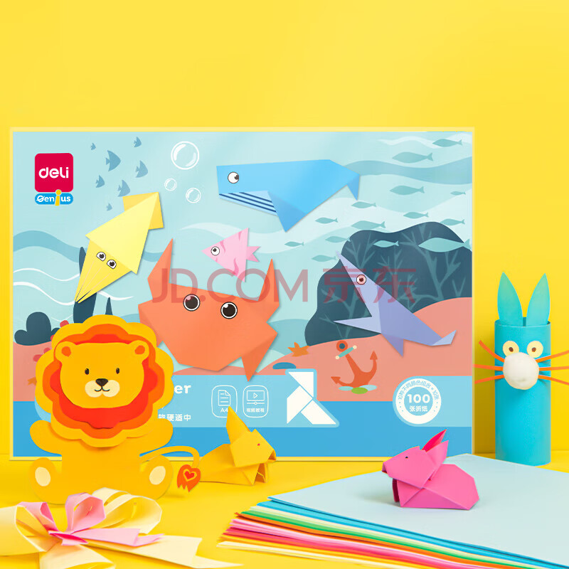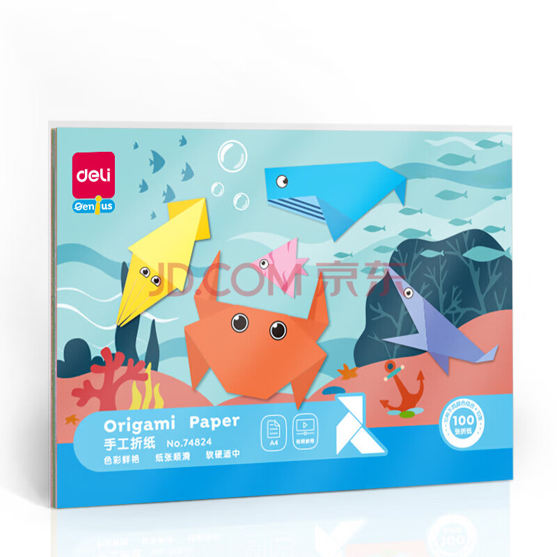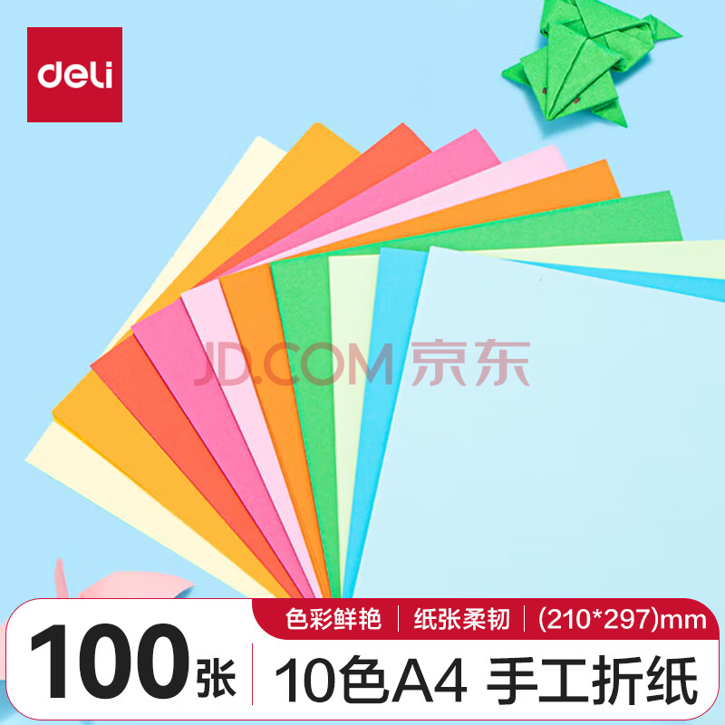 商品相册:得力(deli)10色100张A4彩色折纸升级加厚70g 剪纸软卡纸美术绘画课堂DIY手工纸儿童生日礼物开学文具第1张/共8