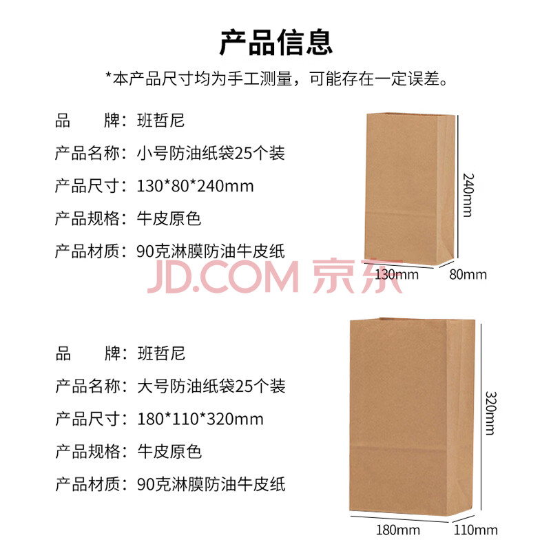 商品相册:班哲尼 防油牛皮纸袋冰箱整理袋蔬菜瓜果食品包装袋淋膜袋90克加厚款第