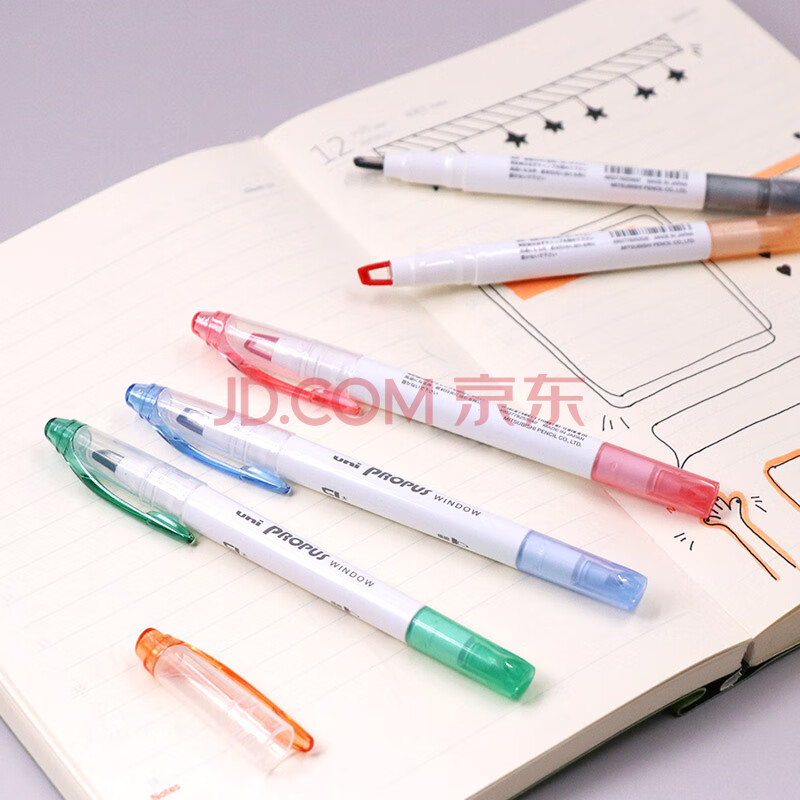 商品相册:uni三菱 双头荧光记号笔 学生作业手账绘画标记笔彩色笔 细0.4mm粗4mm PUS-103T 1支/袋 烟红色第