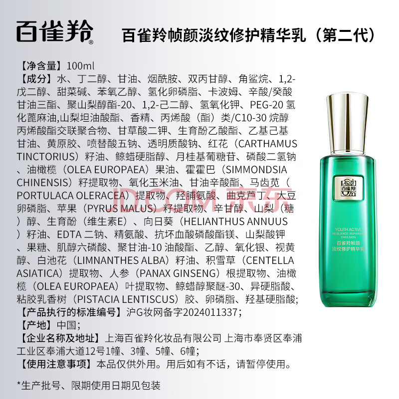 商品相册:百雀羚草本帧颜淡纹修护精华乳100ml淡纹紧致修护品质国货生日礼物第