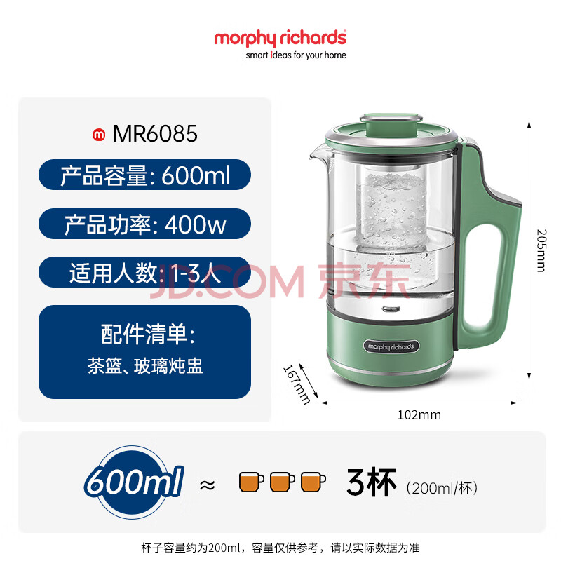 商品相册:摩飞电器(Morphyrichards)养生壶分体便携式煮茶器烧水壶小型办公室家用多功能煮茶壶分体热水壶0.6L MR6085 绿第