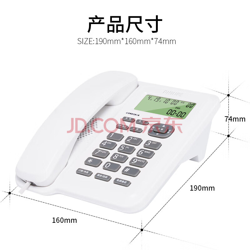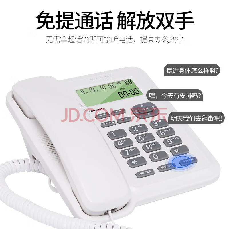 商品相册:飞利浦(PHILIPS)有绳电话机座机 固定电话 办公家用 双接口 免电池 免提通话 CORD281A白色第