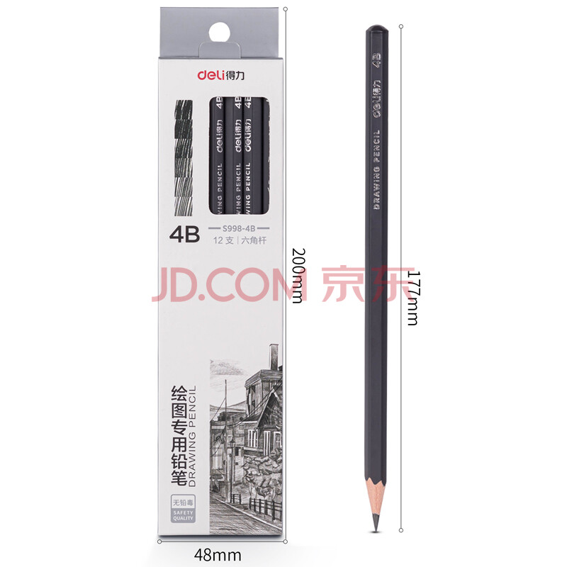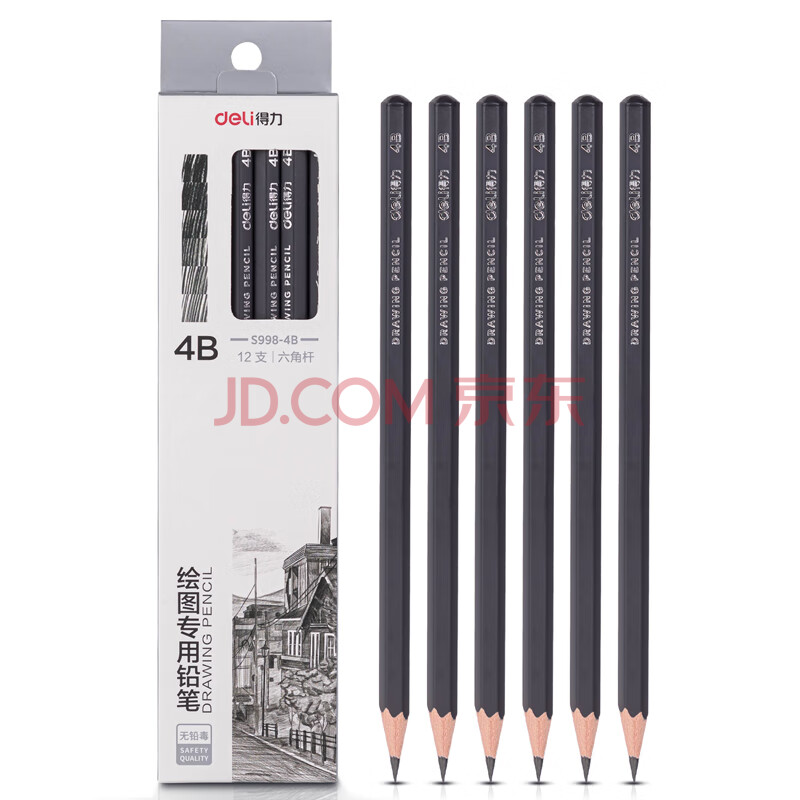 商品相册:得力(deli)绘图铅笔12支4B素描铅笔学生六角杆书写黑铅美术写生工程制图笔初学者专用学生开学文具第