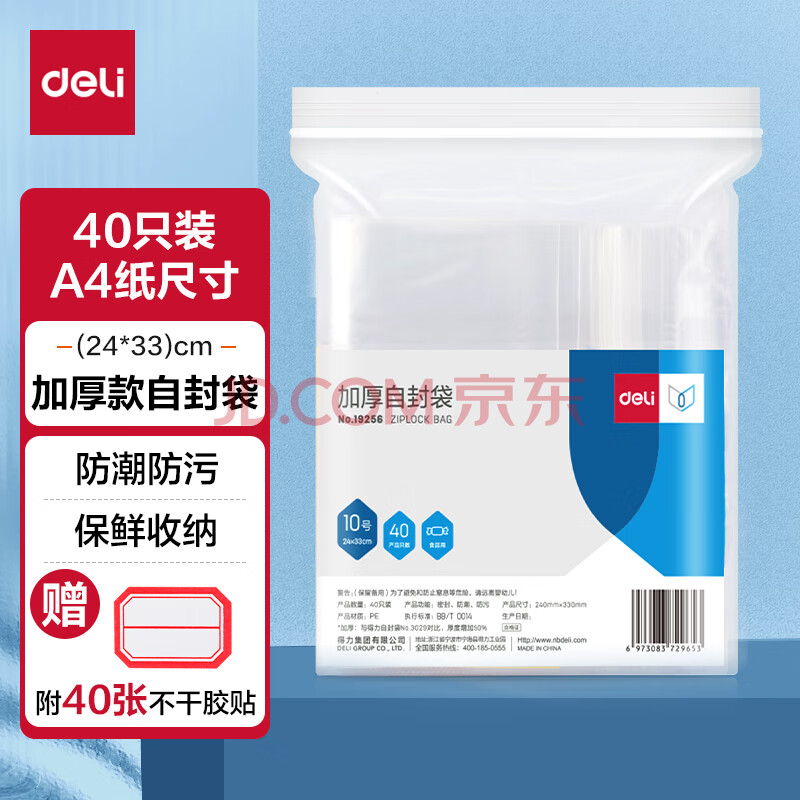 商品相册:得力(deli)食品自封袋10号24*33cmA4尺寸防水收纳 40只装(附标签) 19256第