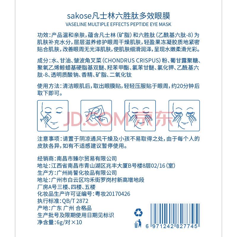 商品相册:sakose凡士林六胜肽多效男士眼膜贴一盒装10对 淡化黑眼圈眼袋紧致抗皱第1张/共7