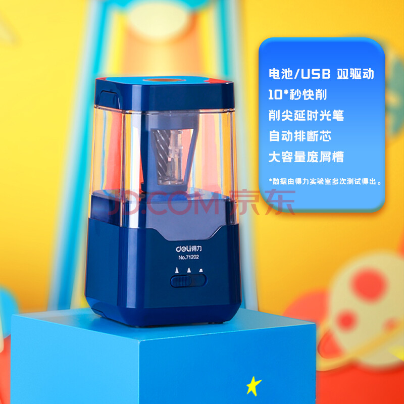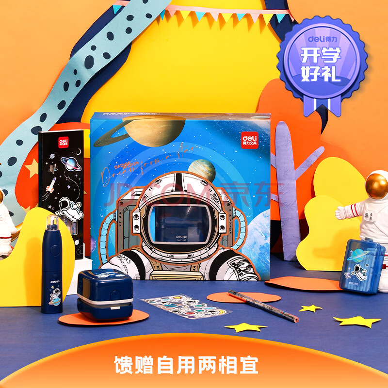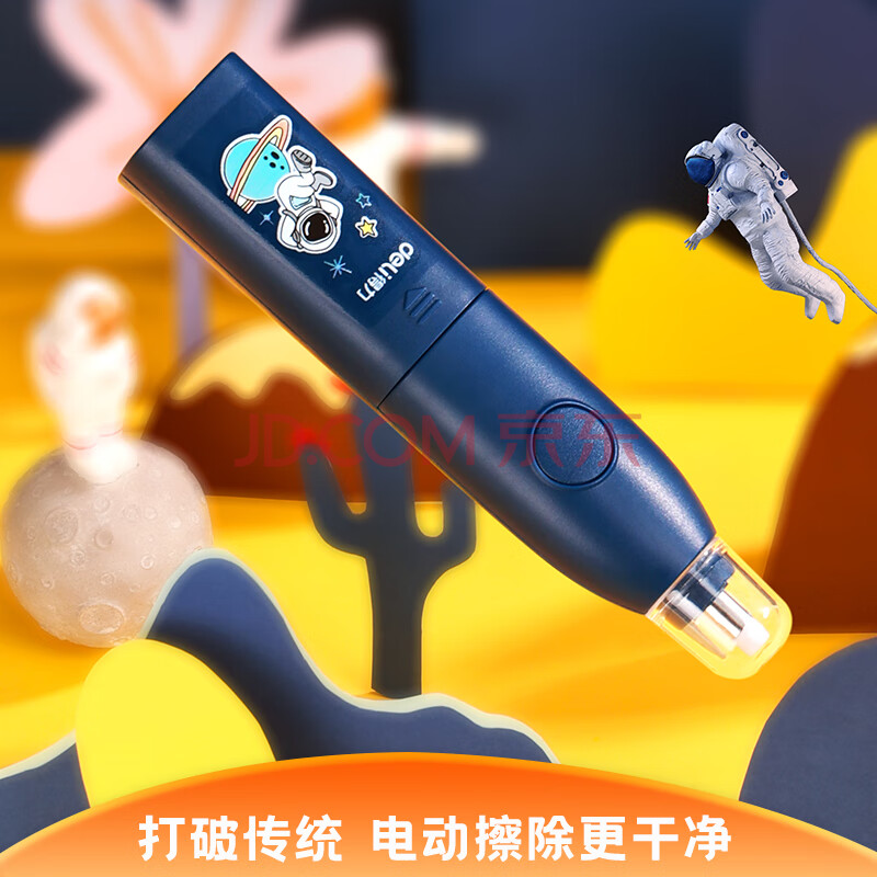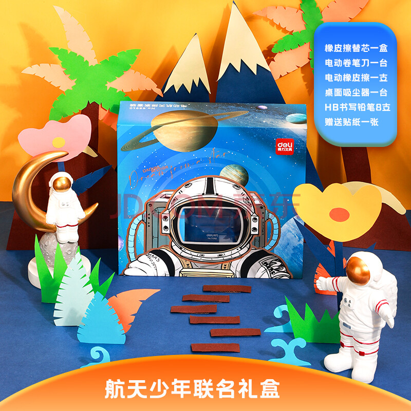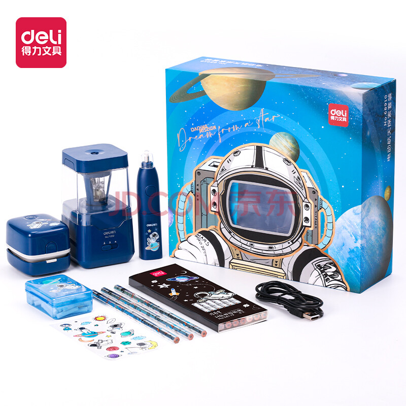商品相册:得力(deli)×中国航天 学生文具套装大礼包 电动削笔机+电动橡皮擦+桌面吸尘器+闪光铅笔+橡皮擦替芯 68910第