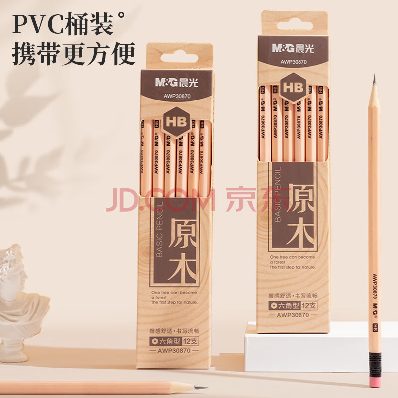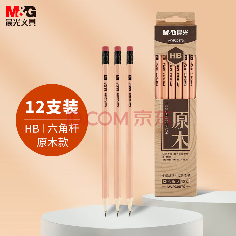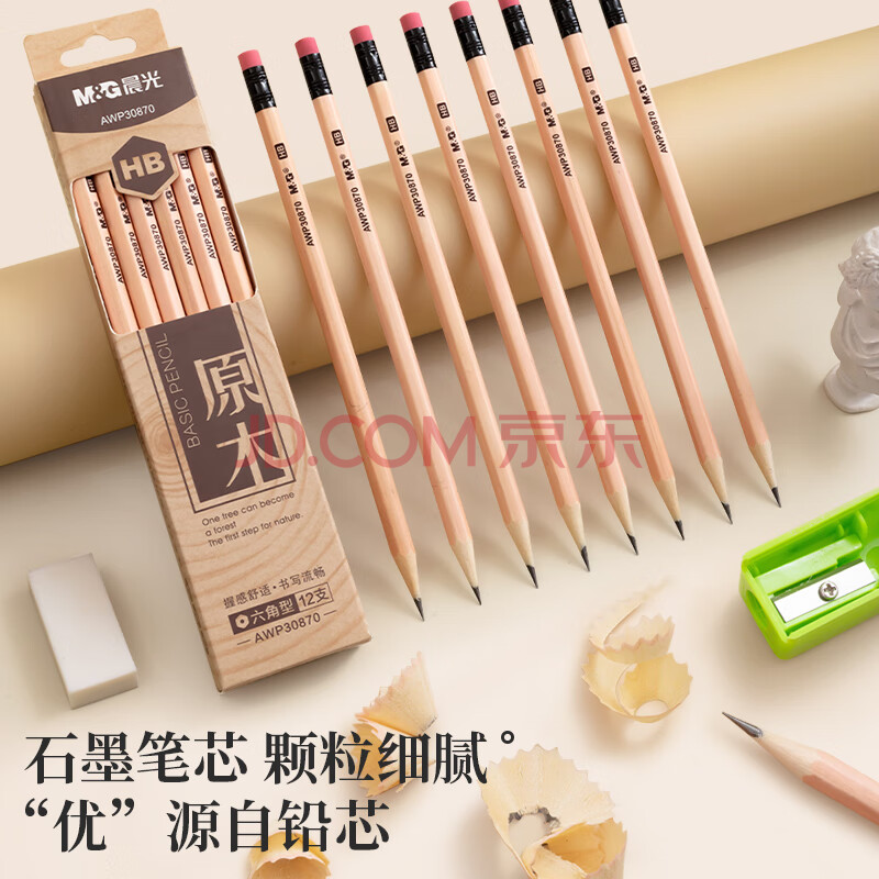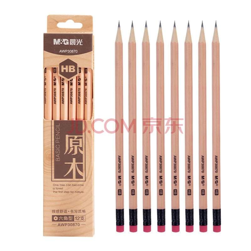 商品相册:晨光(M&G)文具HB铅笔12支 原木六角木杆铅笔 学生开学书写美术素描绘图木质铅笔带橡皮头AWP30870第
