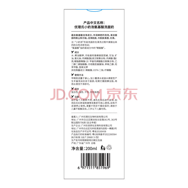 商品相册:优理氏 洗面奶男女士洁面乳氨基酸控油小奶泡温和清洁保湿200ml第
