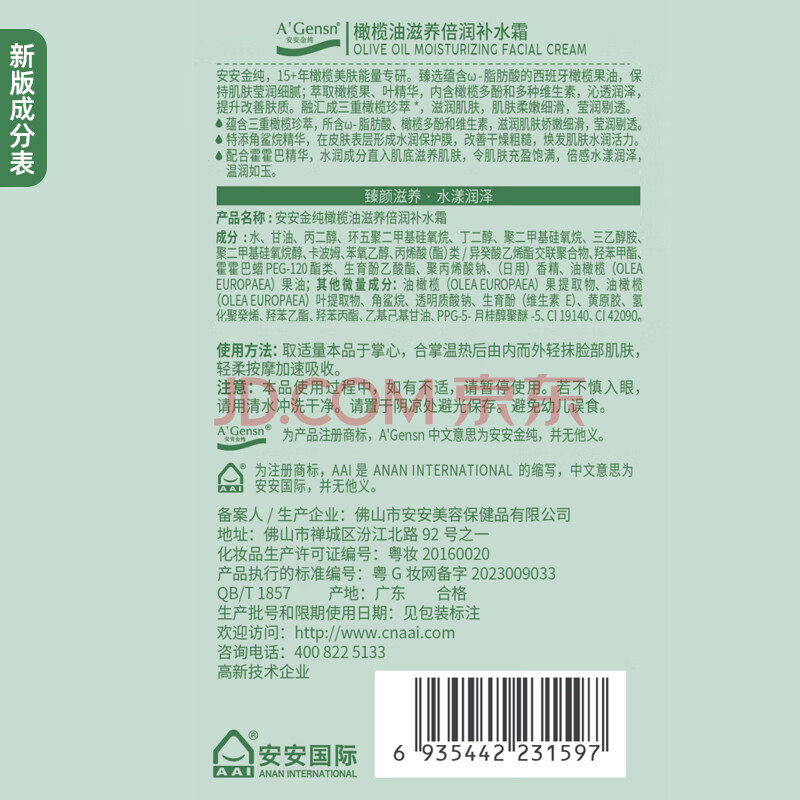 商品相册:安安金纯A'Gensn橄榄油滋养倍润补水霜60g第