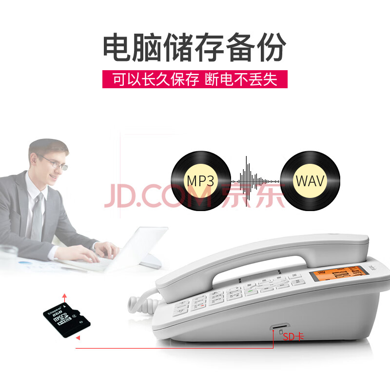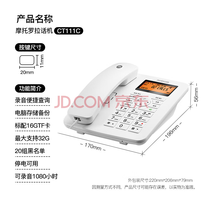 商品相册:摩托罗拉(Motorola)录音电话机 固定座机升级16G卡 可扩展至32G 办公家用电销商务客服电话呼叫中心CT111C白第