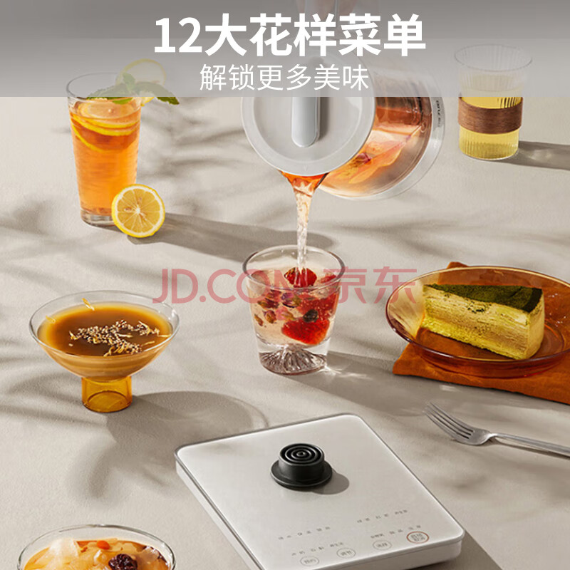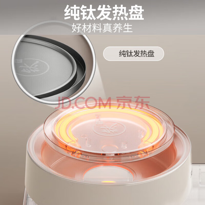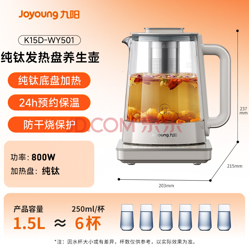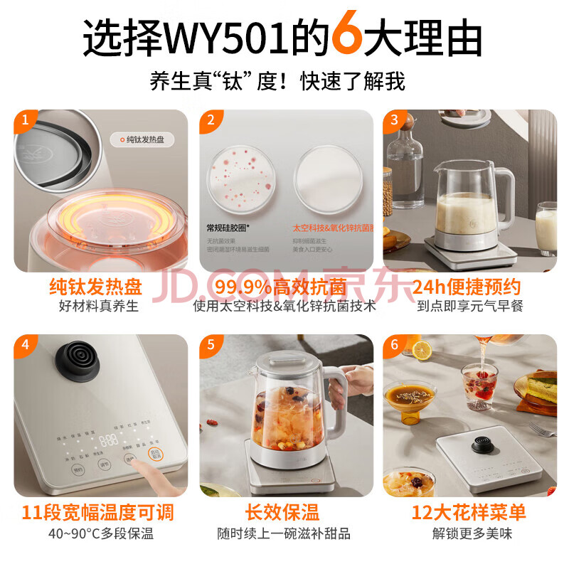 商品相册:九阳(Joyoung)【太空系列】1.5L养生壶玻璃花茶壶 纯钛加热盘抗异味 12大功能 24h保温 0胶水电水壶WY501第