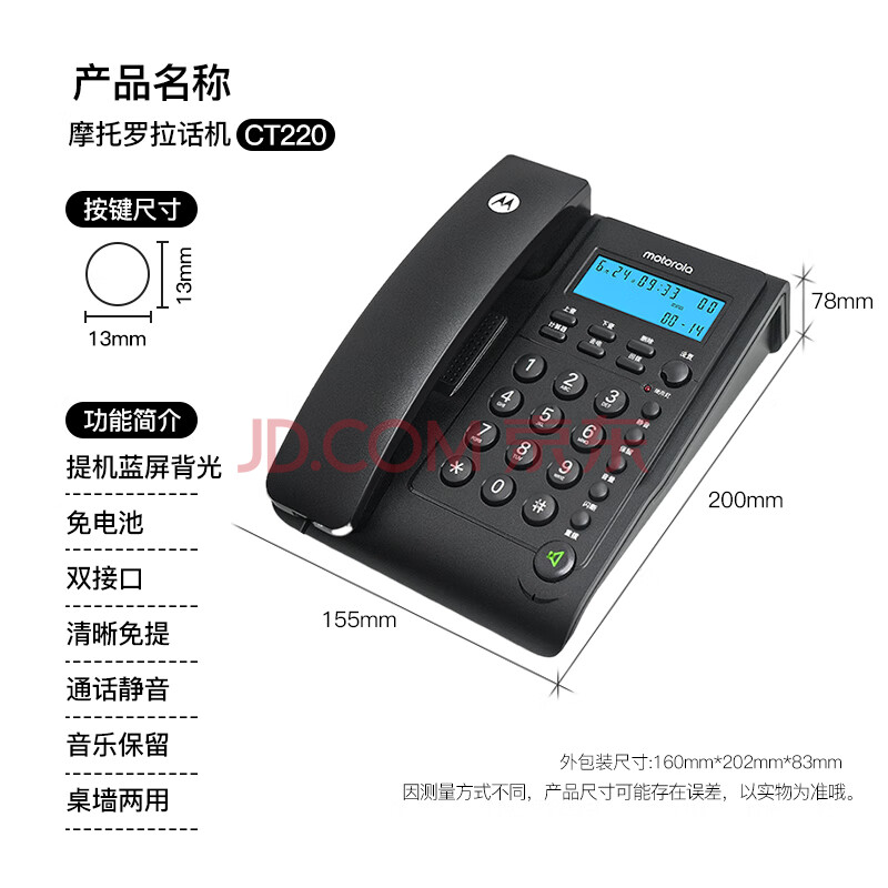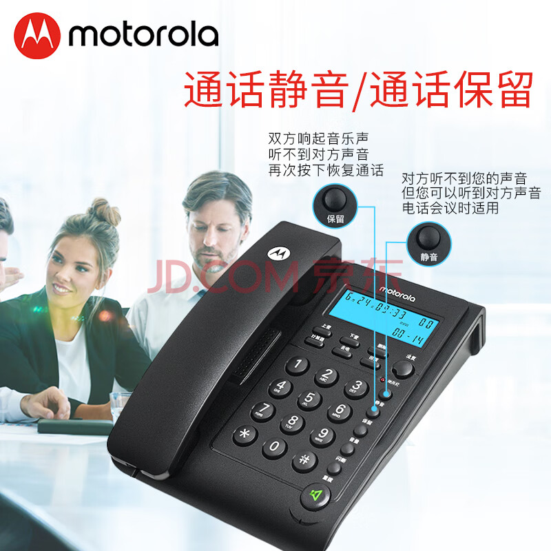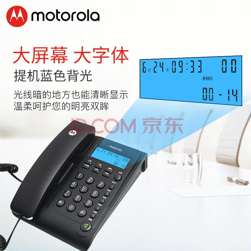 商品相册:摩托罗拉(Motorola)电话机座机 蓝色背光 显示清晰 免提免打扰 桌墙两用 家用办公 有绳固定电话机 CT220黑色第