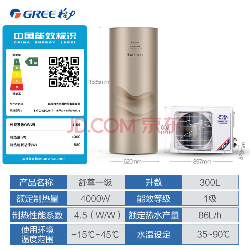 商品相册:格力(GREE)舒尊空气能热水器家用 300升双级变频 超一级能效 WiFi智能 90℃高温 SXTD300LCJW/T-1家电补贴第