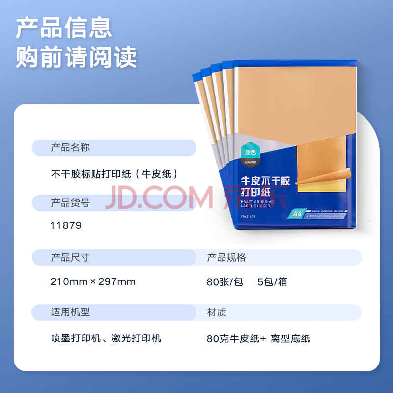 商品相册:得力(deli)A4/400张不干胶标贴打印纸 带背胶牛皮纸标签纸 整张无分割 喷墨激光打印机均适用 11879第