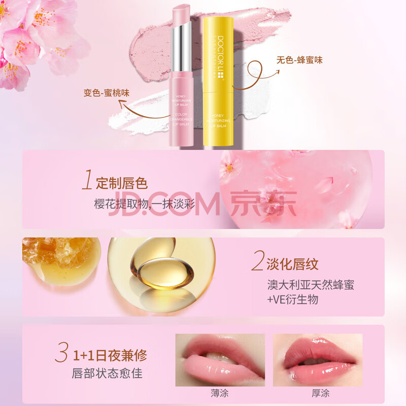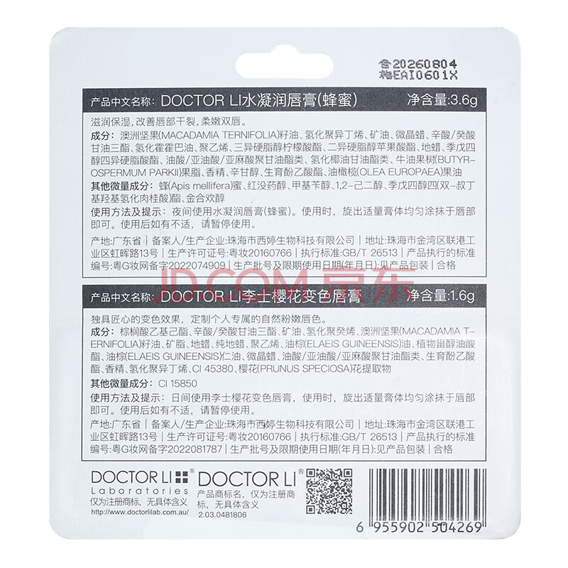 商品相册:李医生 水凝润唇膏3.6g+1.6g(保湿滋润男女士变色唇膏防嘴唇干裂脱皮)第