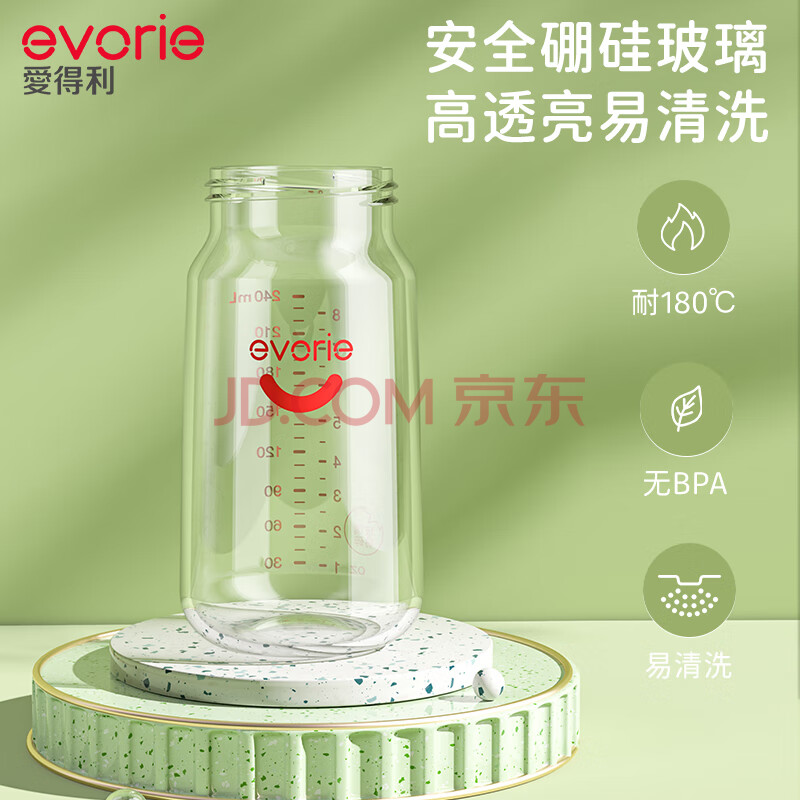 商品相册:爱得利(evorie) 玻璃奶瓶 宽口径奶瓶 婴儿奶瓶240ml (6个月+)第