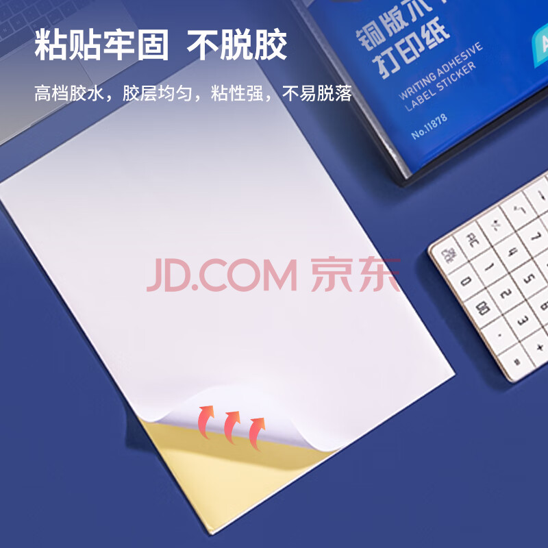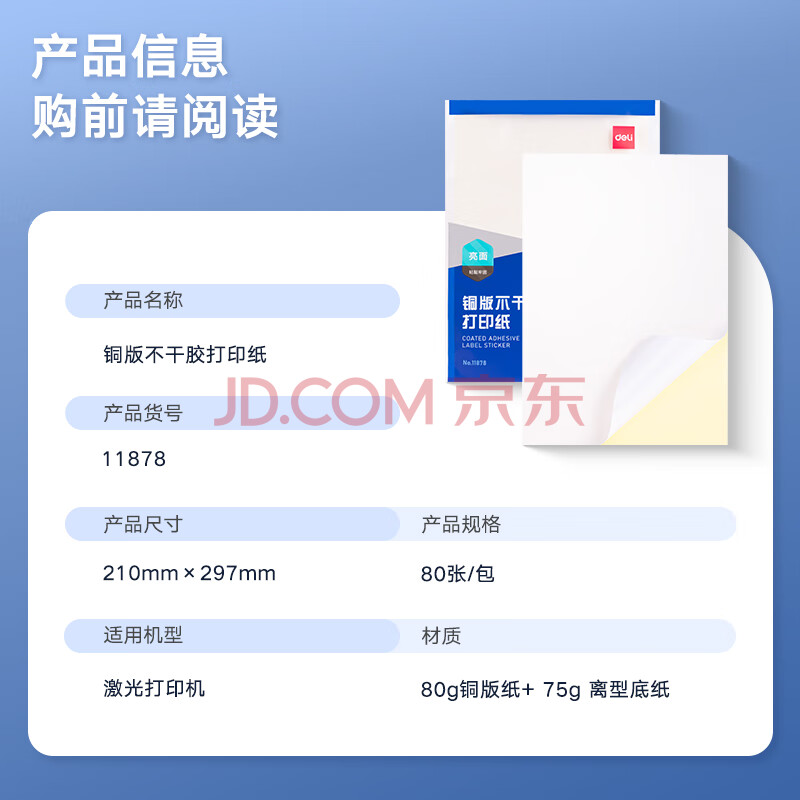 商品相册:得力(deli)A4/80张不干胶标贴打印纸 带背胶光面铜版标签纸 整张无分割 激光打印机适用 11878第