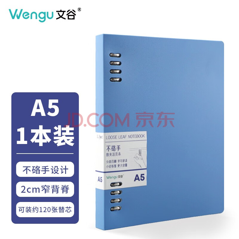 商品相册:文谷(Wengu)A5/60张可拆卸不硌手铁夹活页本20孔高颜值商务简约纯色横线本大容量办公用笔记本子 BI010A5蓝第