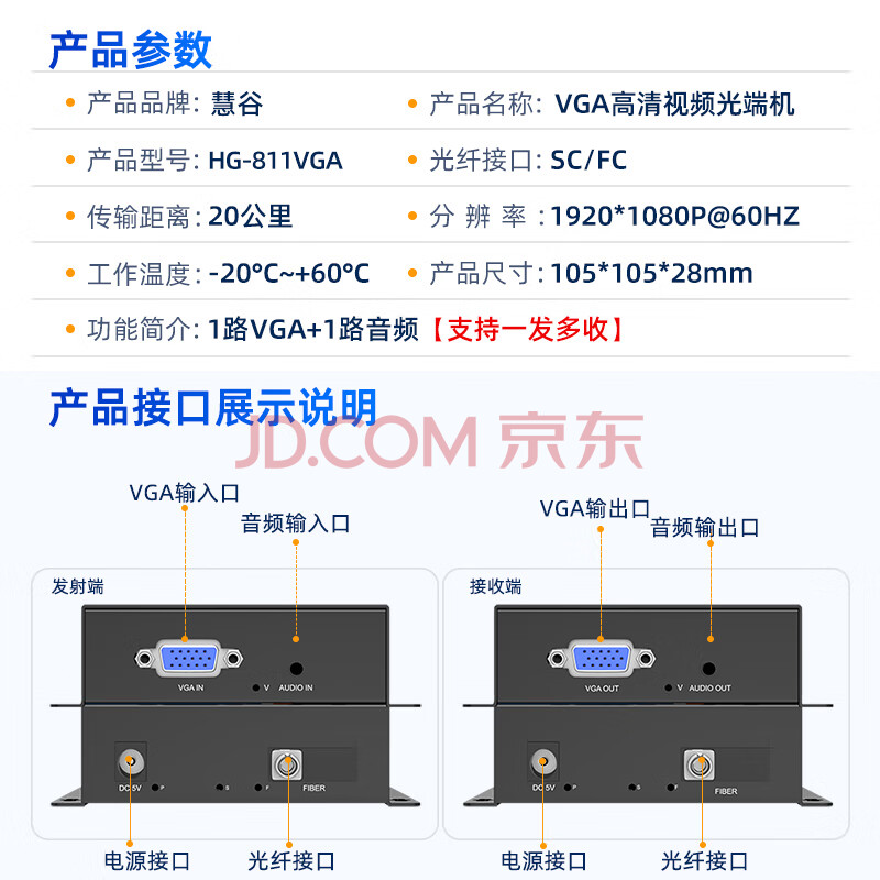 商品相册:慧谷 VGA光端机 高清视频光端机 VGA光纤延长器 1路VGA+1路音频 FC接口 1对价 HG-811VGA第