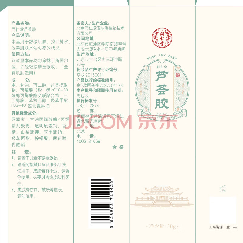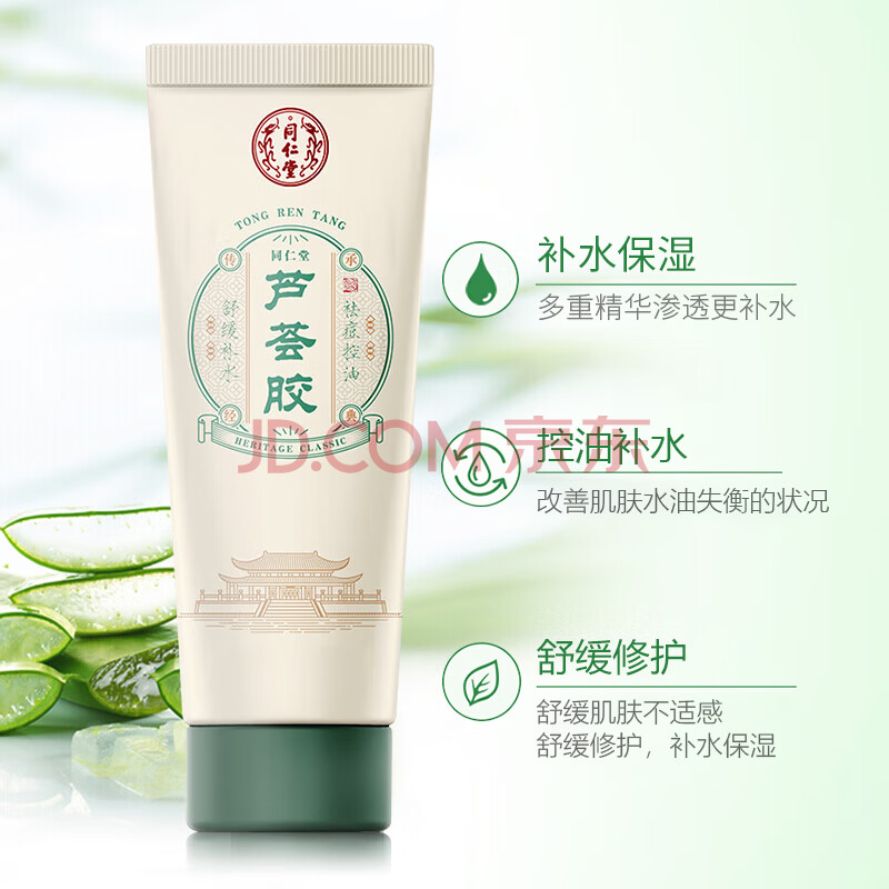 商品相册:同仁堂芦荟胶50g控油祛痘 舒缓修护晒后肌 补水保湿男女第