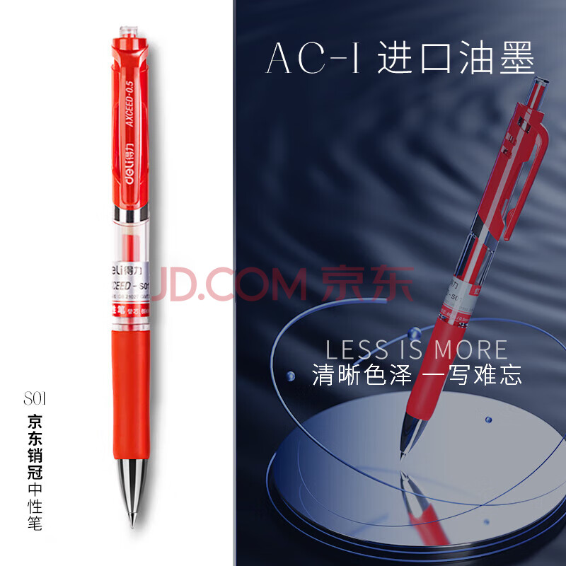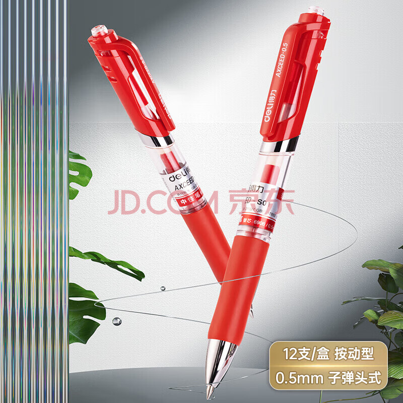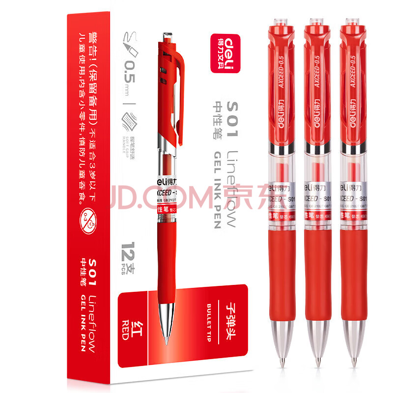 商品相册:得力 按动中性笔 0.5mm子弹头经典办公签字笔水笔 舒适握感软胶 书写流畅不断墨 红色 12支/盒 S01第