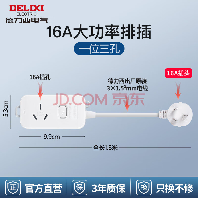 商品相册:德力西(DELIXI) 16A大功率空调插座3C认证 带开关插线板/插排/排插/接线板/拖线板 1位总控全长1.8米第