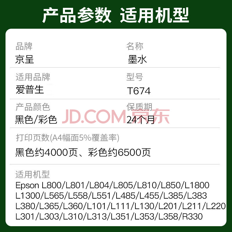 商品相册:京呈T674墨水六色套装适用爱普生L805 L1800 L850 L801 L810 L800 L801 L360 epson墨仓式打印机墨水T6741-T6746第