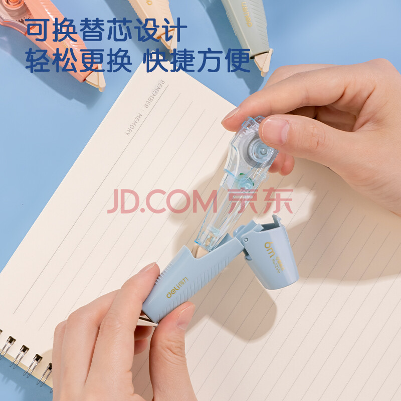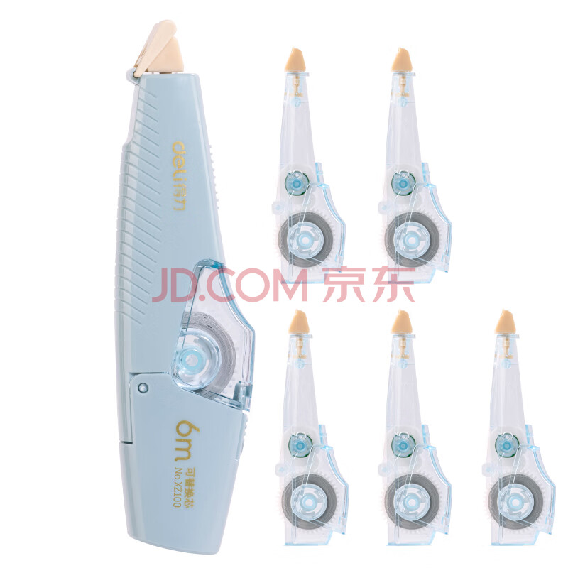商品相册:得力(deli)36m蓝色笔型修正带套装1个修正带本体+5个修正带替芯 开学文具顺滑不断带强遮盖力复印无痕大容量第