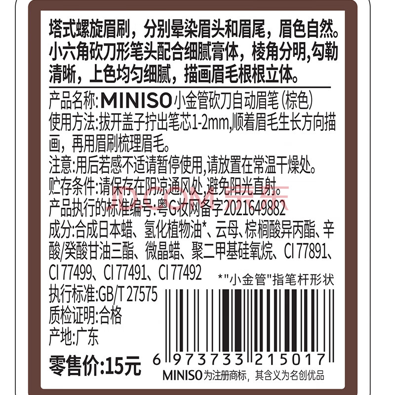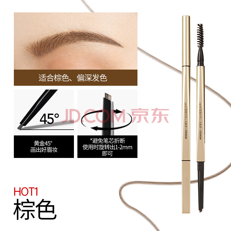 商品相册:名创优品(MINISO)小金管自动眉笔防水防汗不掉色眉刷笔持久防水 棕色1支装 第1张/共7